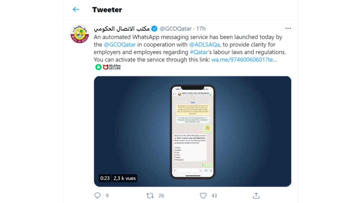 An automated WhatsApp messaging service has been launched today by the @GCOQatar in cooperation with @ADLSAQa, to provide clarity for employers and employees regarding #Qatar's labour laws and regulations. You can activate the service through this link: https://t.co/2MgWrHRPS7pic.twitter.com/mzBissg0Ue
