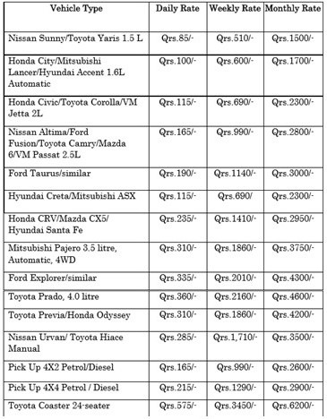 The below rate includes comprehensive insurance as per Qatar law and a replacement vehicle (available range or alternative category) when the original is sent for service or repair. In the event of an accident or any damage to the vehicle, a police report must be obtained for insurance coverage to be applicable. The hirer will be responsible for the first Qrs.850/- (excess insurance charge) if the accident or damage is due to the fault of the driver. (This clause will not be applicable if with EUROPCAR driver).