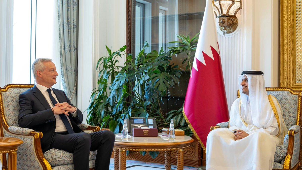 Le Premier ministre et ministre des Affaires étrangères, SE Cheikh Mohammed bin Abdulrahman bin Jassim Al-Thani, a rencontré lundi le ministre de l'Économie et des Finances de la République française, SE Bruno Le Maire, en marge « France Qatar Investors Meetup et Startup Meetup » organisé à Doha le 20 mai 2024.