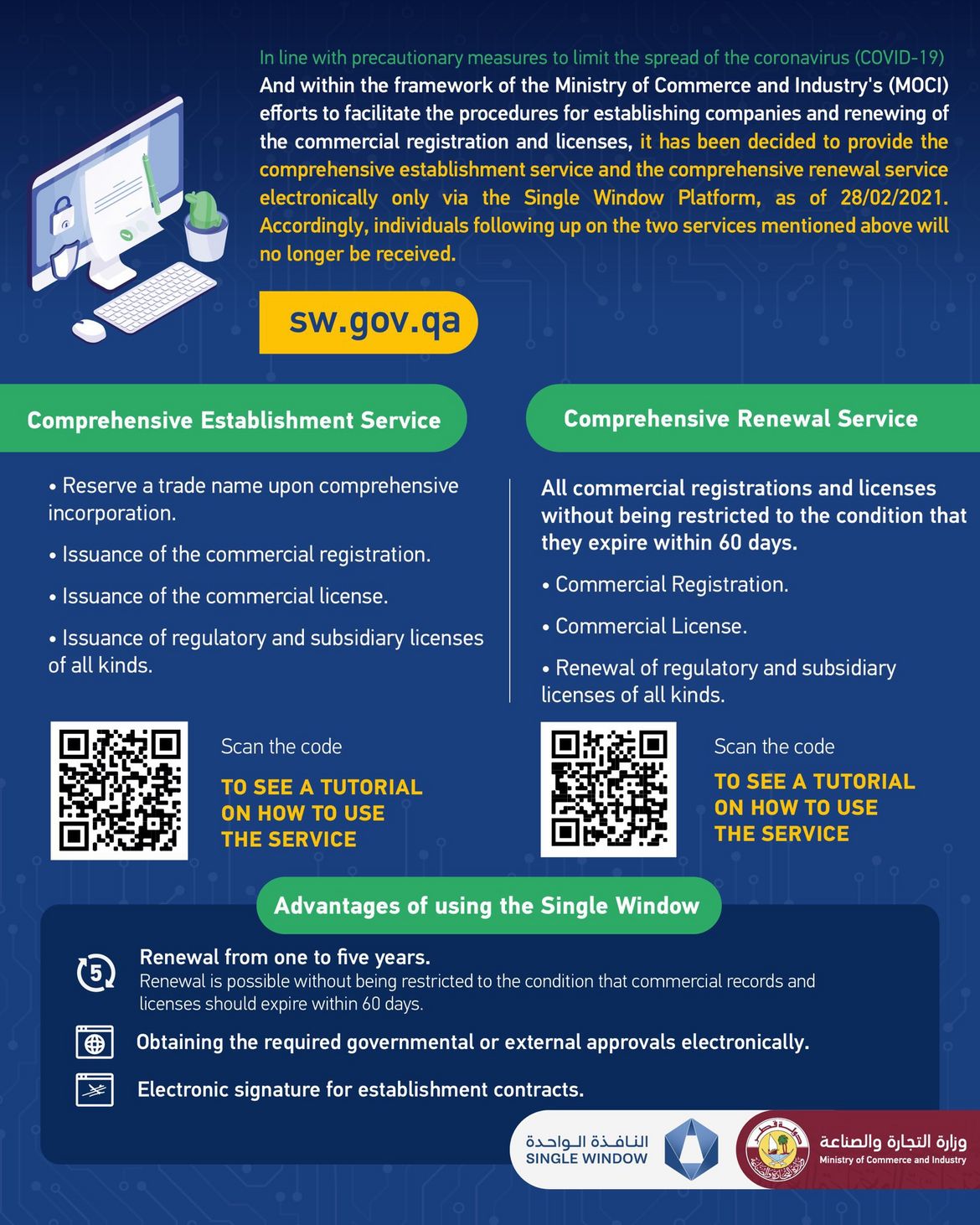 In line with precautionary measures, it has been decided to provide the comprehensive establishment and renewal services only via the "Single Window" platform, as of 28/02/2021. Individuals following up on these services will no longer be received at the MOCI QATAR and its branches.