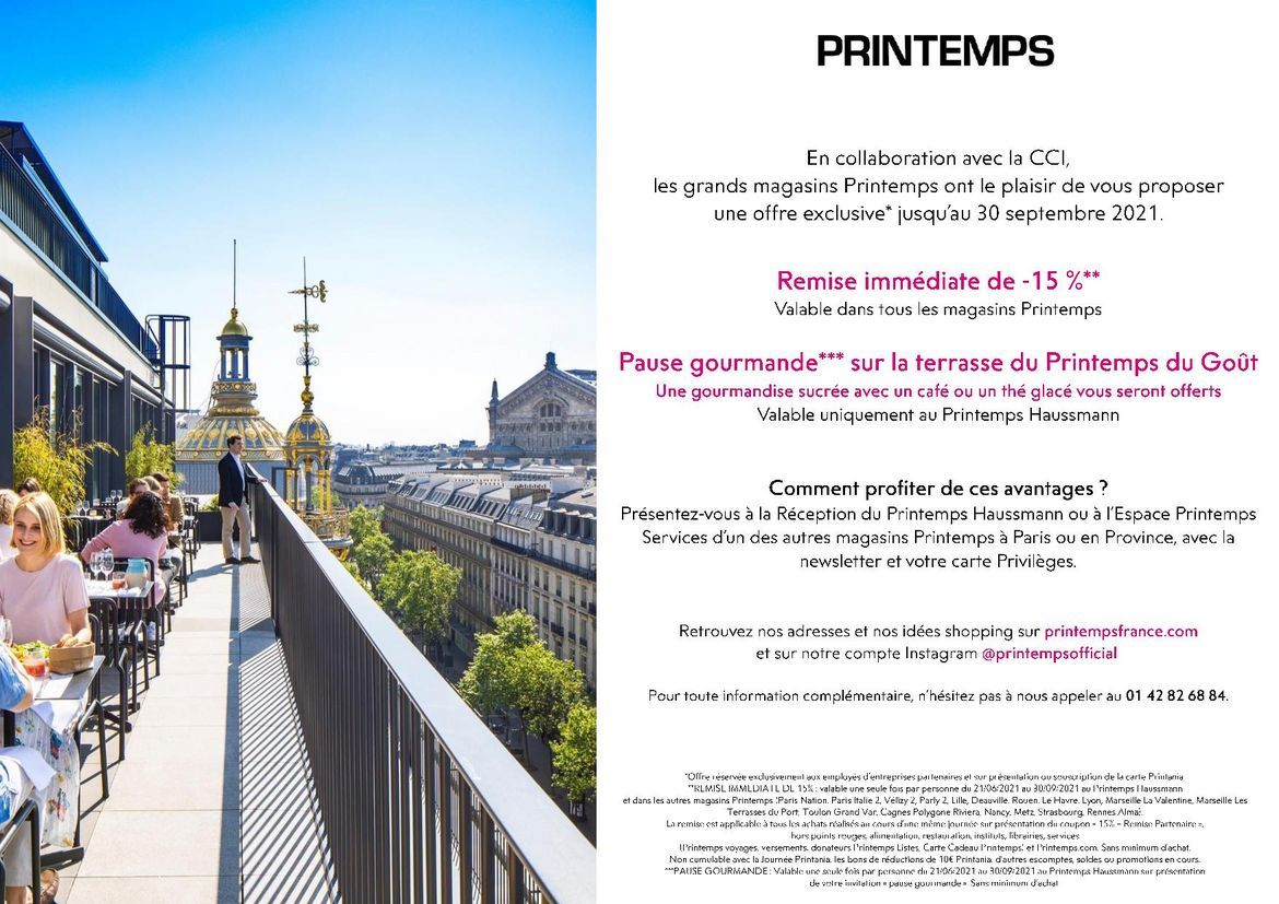 Une remise immédiate de -15% (valable dans tous les magasins Printemps) et une pause gourmande sur la terrasse du Printemps du Goût (valable uniquement au Printemps Haussmann)