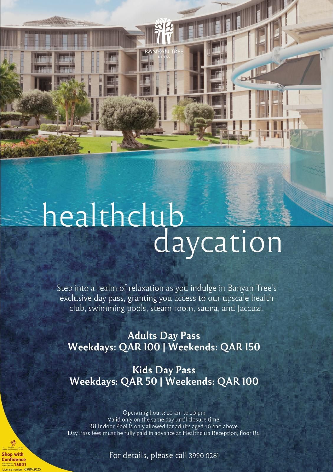 Plongez dans un univers de détente en profitant du pass journée exclusif de Banyan Tree, qui vous donne accès au club de santé haut de gamme, aux piscines, au bain à vapeur, au sauna et au jacuzzi.