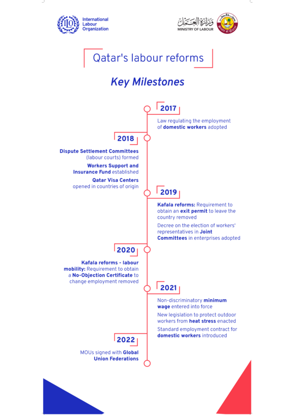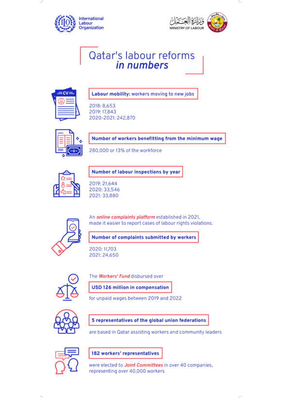 Ces dernières années, le gouvernement du Qatar s'est lancé dans un vaste programme de réforme du travail conforme à la Vision nationale 2030 (QNV 2030). Ces réformes contribueront à la création d'une économie compétitive, diversifiée et fondée sur le Savoir. Une législation et des systèmes ont été introduits qui ont généré des changements importants sur le marché du travail dans des domaines tels que la mobilité de la main-d'œuvre, la protection des salaires, le règlement des différends, la migration de la main-d'œuvre et le dialogue entre les travailleurs et la direction.