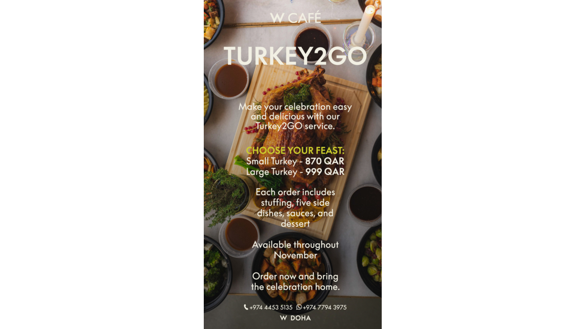 Le W Café du W Doha facilite vos célébrations ce mois de novembre avec son service "Turkey2GO", proposant des dindes accompagnées de cinq accompagnements, sauces et dessert, disponibles dès 870 QAR.