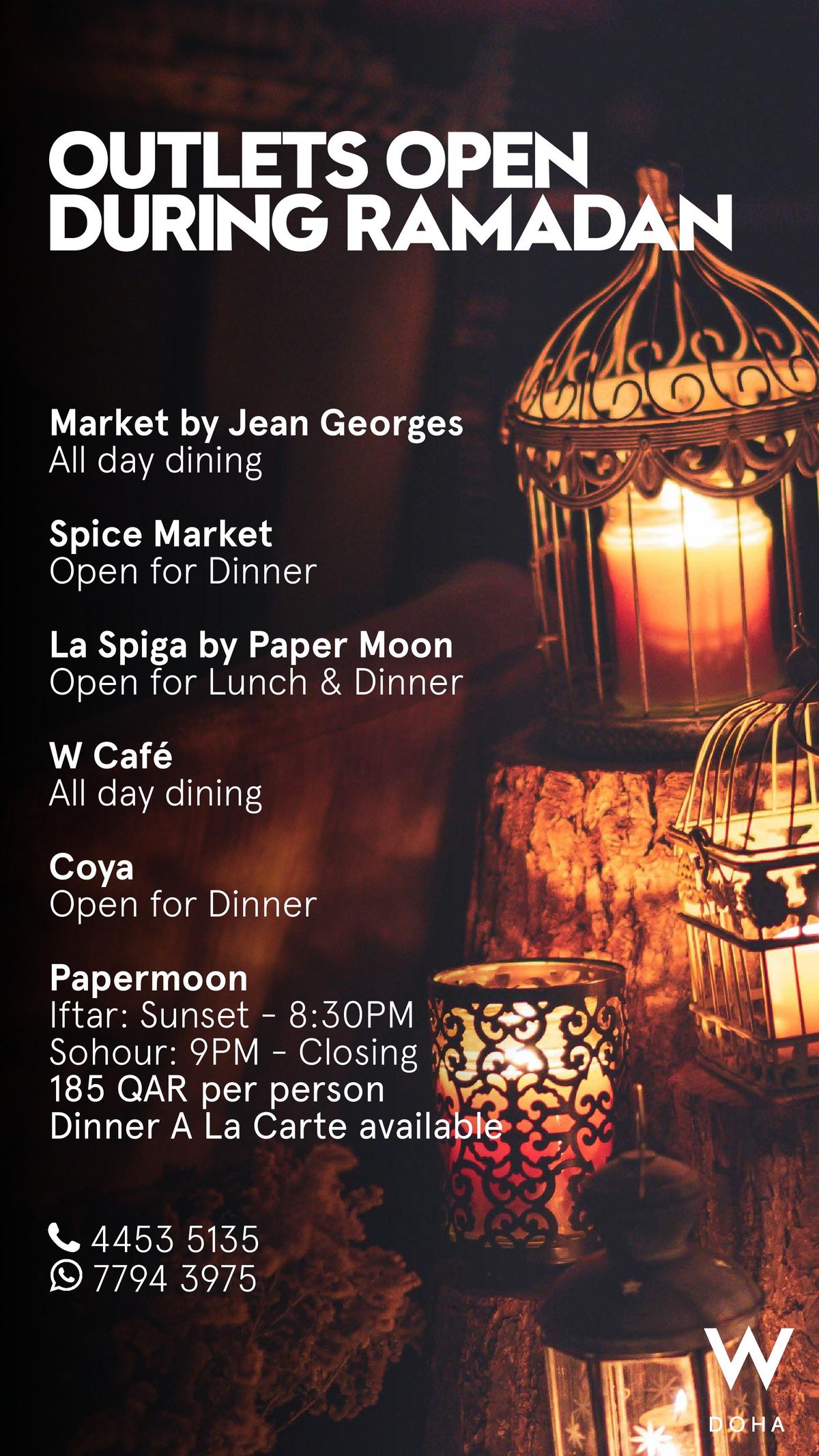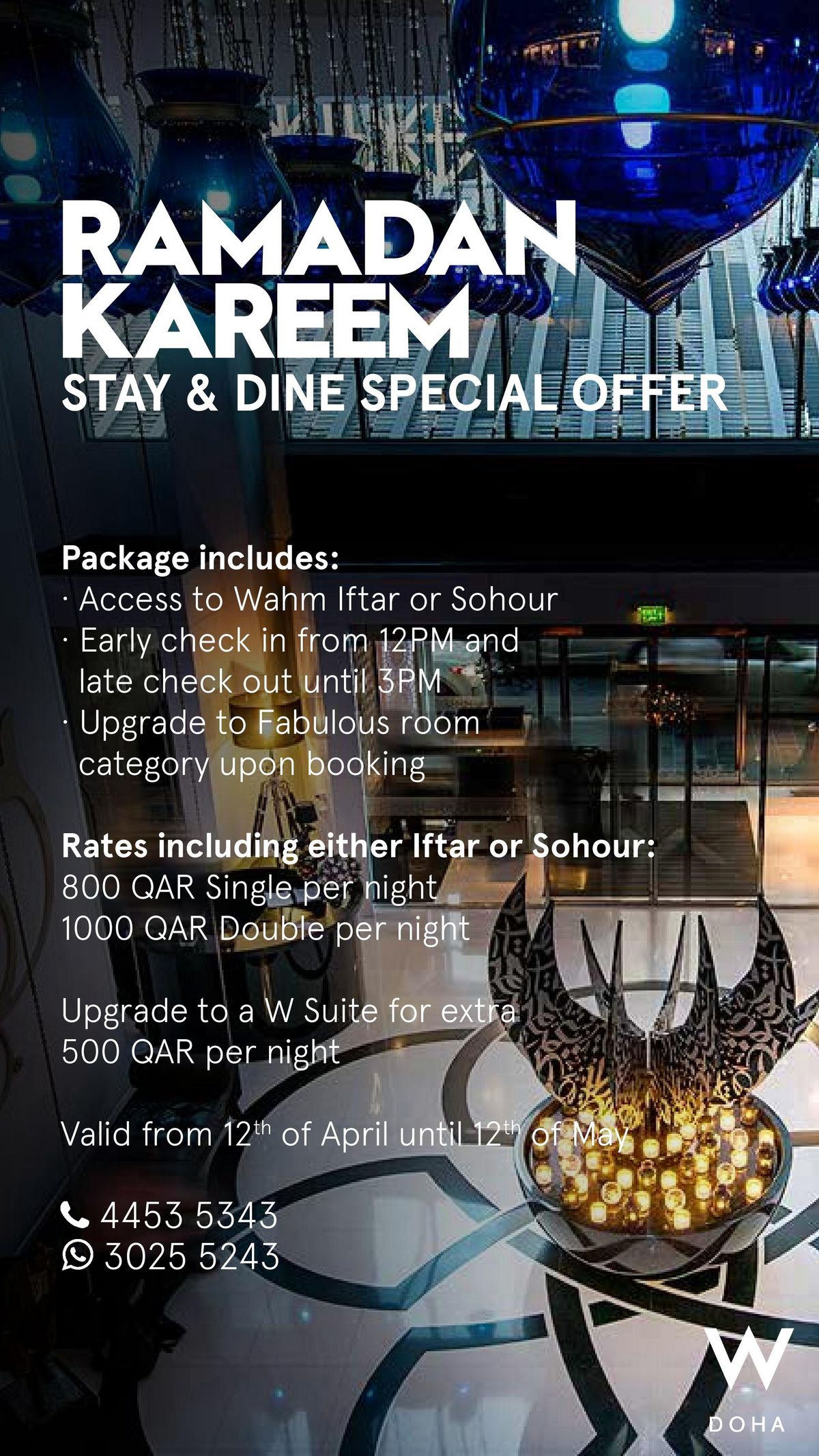 Membres W Doha April offers Le 30/03/2021 Let the W Doha light up your month with their newest happenings and promotions Voir en mode carousel Voir en mode mosaïque What's new next April