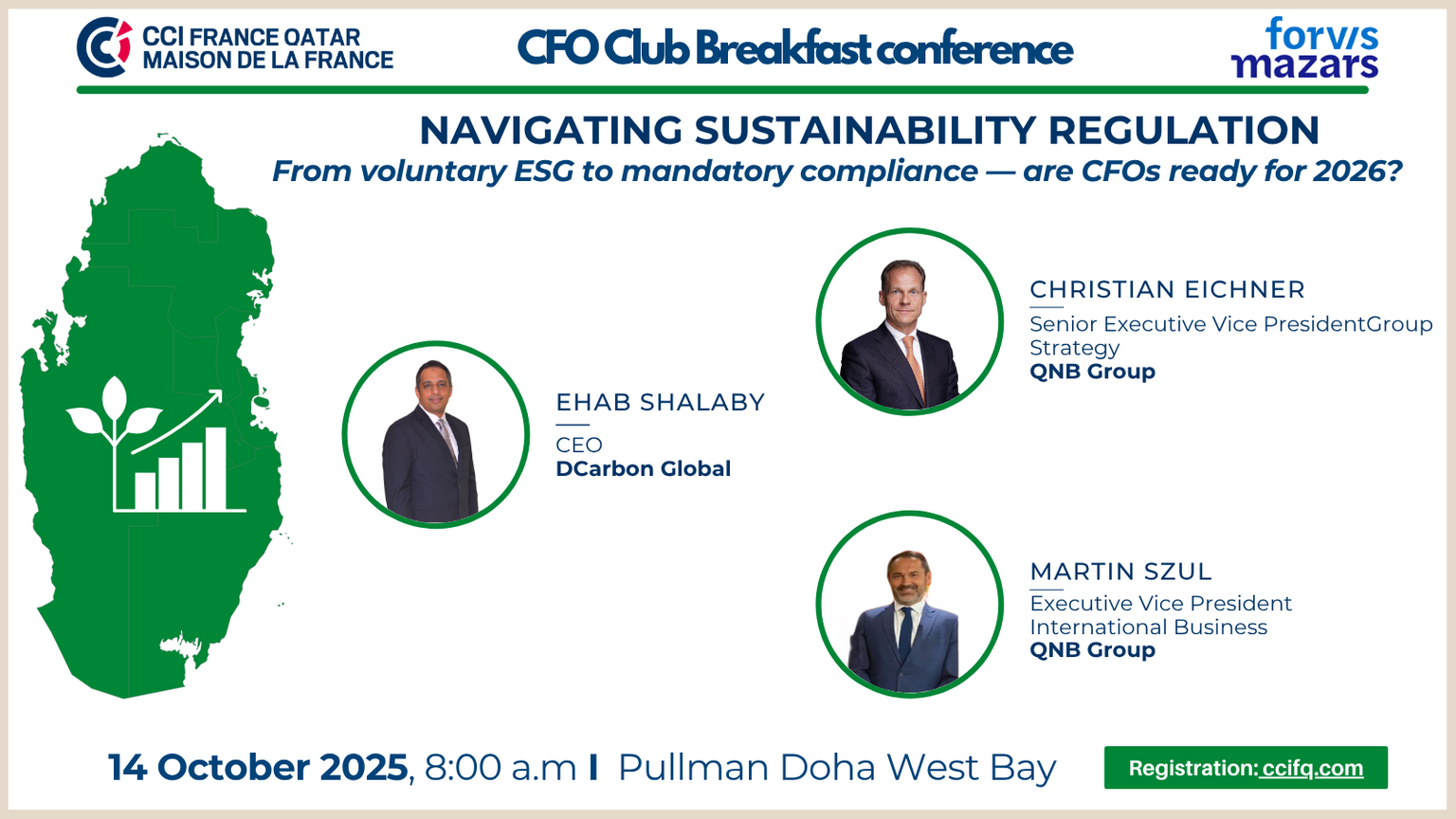 This month, the CFO Club will shed light on a key issue: the arrival of sustainability regulation in Qatar, driven by the QFC and the QCB, and its concrete implications for financial governance, risk management, and corporate competitiveness.