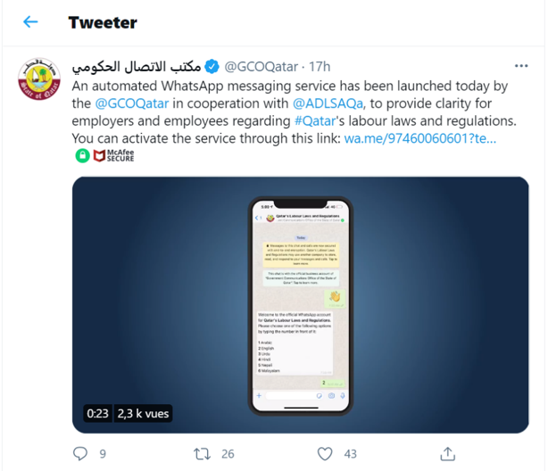 An automated WhatsApp messaging service has been launched today by the @GCOQatar in cooperation with @ADLSAQa, to provide clarity for employers and employees regarding #Qatar's labour laws and regulations. You can activate the service through this link: https://t.co/2MgWrHRPS7pic.twitter.com/mzBissg0Ue