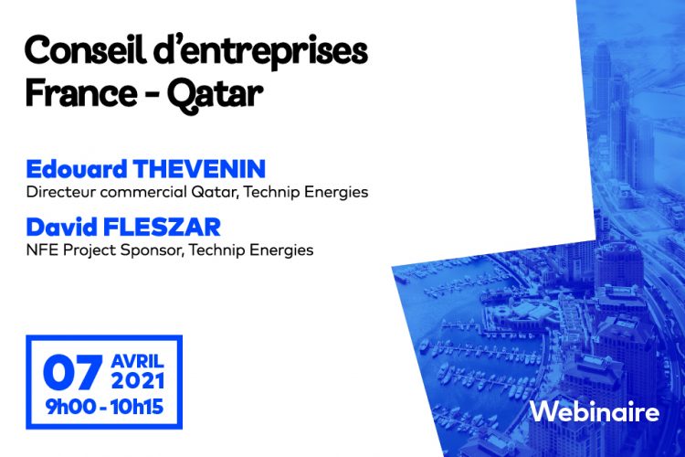 Nous vous invitons à prendre part au prochain webinaire du conseil d’entreprises France- Qatar organisé par MEDEF International autour de M. David FLESZAR, North Field East (NFE) Project Sponsor, Technip Energies & M. Edouard THEVENIN, directeur commercial Qatar, Technip Energies, le mercredi 7 avril prochain de 9h00 à 10h15 (heure de Paris).
