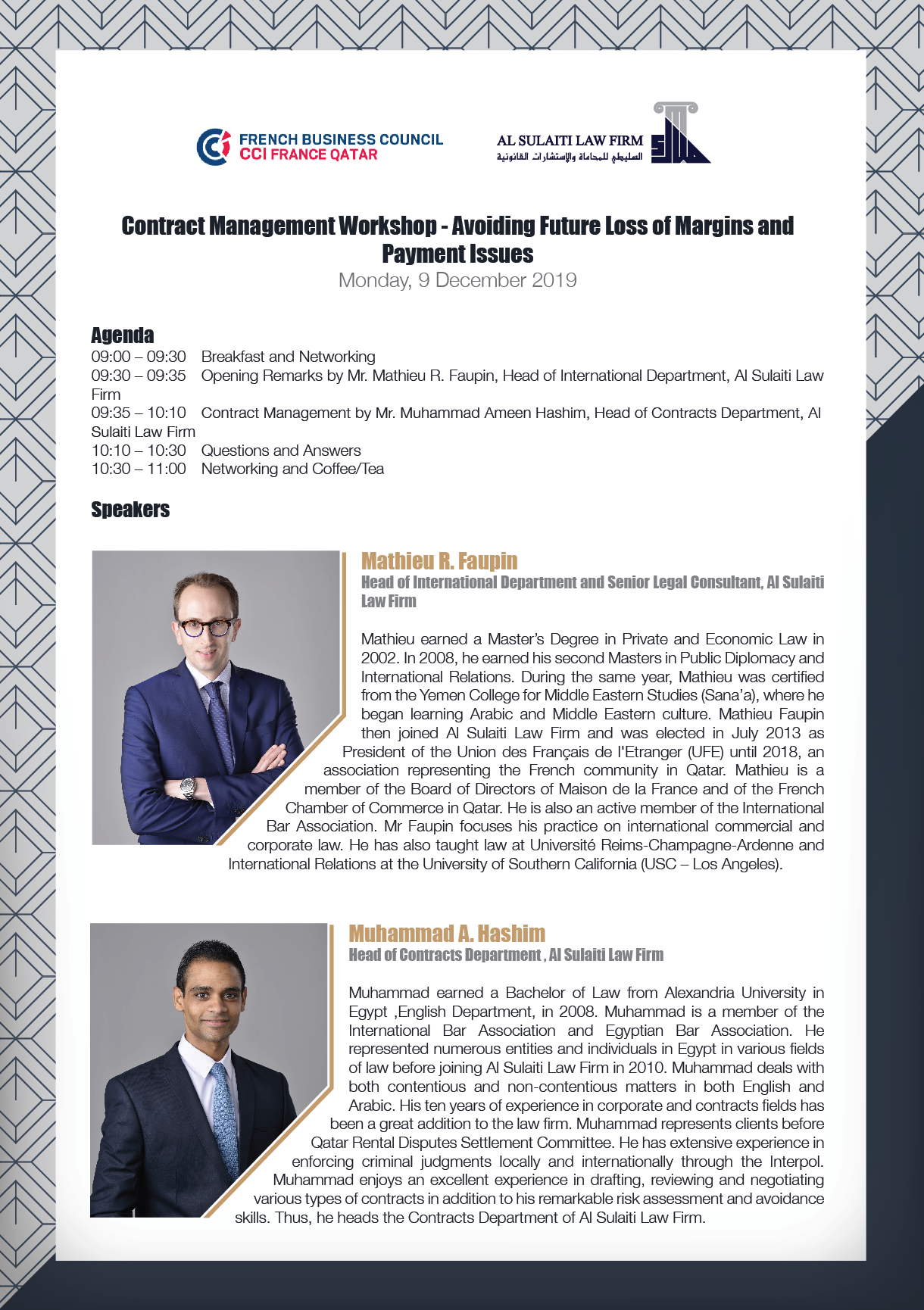 En partenariat avec le cabinet Al Sulaiti Law firm, cet atelier mettra en avant les points importants pour limiter les risques de perte de marge et de retard de paiement